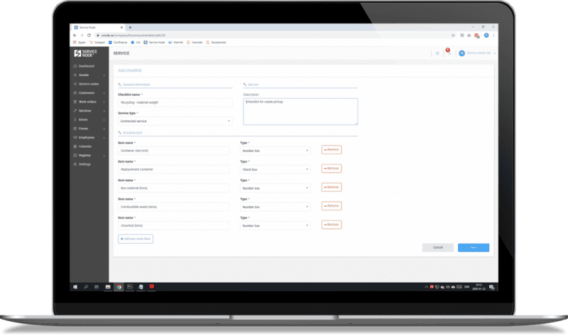 Service Node has a built-in tool easy to use for creating custom checklists. Checklists can then be connected to any asset in your organisation in need of service and maintenance.